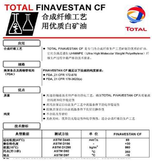 TOTAL FINAVESTAN CF是專門為合成纖維生產工藝研制的優質白礦油,它完全滿足諸如UHMWPE(Ultra High Molecular Weight Polyethylene)纖維生產過程中最嚴格的技術要求。