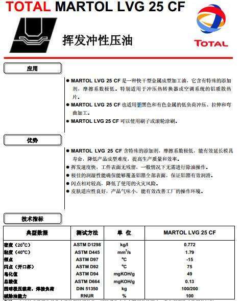 1. MARTOL LVG 25 CF是一種快干性金屬成型加工油,它含有特殊的添加劑,摩擦系數極低。特別適用于沖壓熱轉換器或空調系統的鋁質散熱片