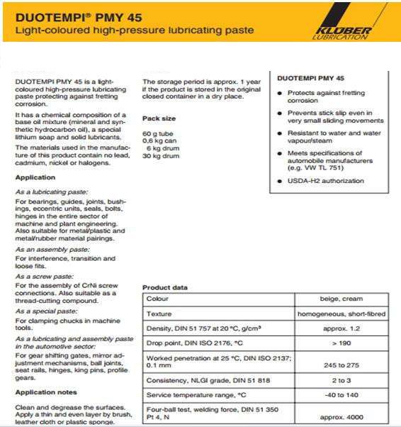 DUOTEMPI PMY 45是淺色高壓潤滑膏為正的連接粘貼的潤滑劑,在中等溫度下被暴露于主要是干燥的條件下。 根據礦物和合成烴油與固體潤滑劑和專用鋰皂DUOTEMPI PMY 45。 DUOTEMPI PMY 45方便的安裝和拆卸,用力過度加載的護照和芯片的連接,而違反微動(微動腐蝕)。