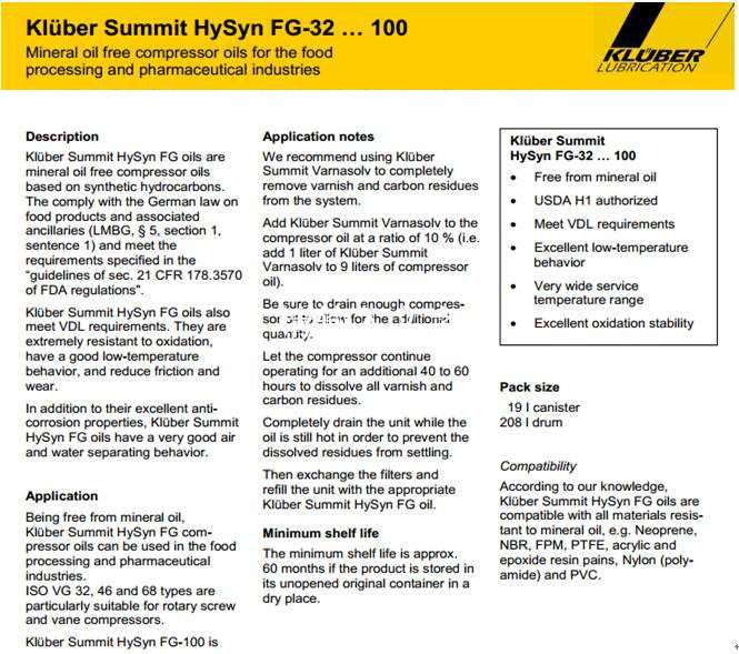 Kluber Summit HySyn FG油空氣壓縮機油的基礎上合成烴。 這些油與礦物油和其它的合成烴油混合。