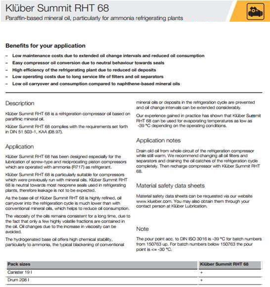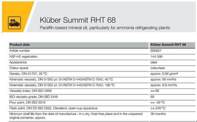 Kluber Summit RHT 68是制冷壓縮機(jī)油,石蠟基礦物油的基礎(chǔ)上。
