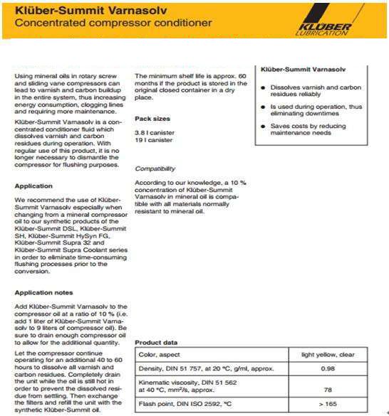 Kluber Summit Varnasolv是洗滌劑添加劑作用的合成酯油的清洗濃縮物的基礎(chǔ)上。 此濃縮物是與兩個的礦物油,合成烴油,酯油和基于聚乙二醇油混溶。