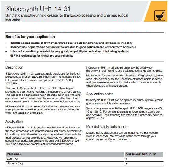 克魯勃UH1 14-31是專門為食品,醫(yī)藥等行業(yè)。 Klubersynth UH1 14-31為主要特征,其優(yōu)異的低溫性能,良好的耐水性和有效的腐蝕和磨損保護(hù)。