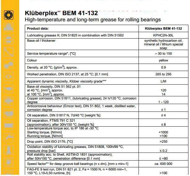 KLüberplex BEM 41-132基于合成烴油、礦物油和特殊鋰皂。特殊添加劑,確保最佳的抗氧化以及抗磨損和抗腐蝕的保護。