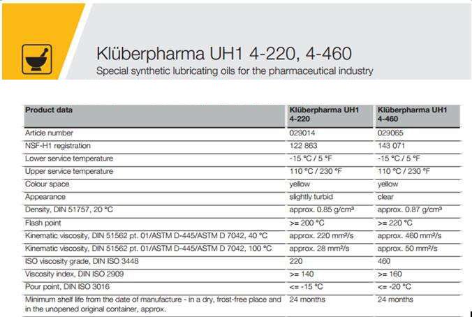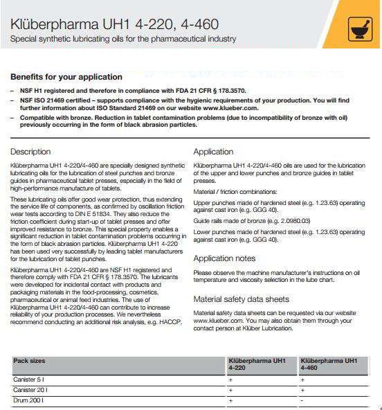 Kluberpharma UH1 4-220、 4-460醫藥工業專用合成潤滑油,專門用于制藥行業的潤滑平板打孔和壓片機(壓片),特別是生產高功率的青銅指南。