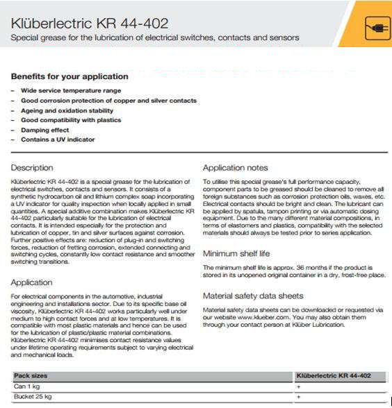 Kluberlectric KR 44-電氣開關,接觸和傳感器的潤滑特殊潤滑脂,接觸器和傳感器。 它包括合成烴油和鋰皂。 該產品含有UV為便于小劑量的質量控制指標。 一個特殊的添加劑組合使得它特別適用于電氣元件的潤滑。 它保護特別是銅,錫和銀的表面不受腐蝕。 其他積極的效果包括減少插件和移位勢力,減少微動腐蝕,增加了插頭和開關周期在一個恒定的低的接觸電阻,改進的換擋感覺。