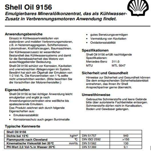 殼牌9156汽車水箱寶液 防銹防凍液 發動機水冷卻液乳化抑制劑在柴油發動機水冷卻系統,應用于防止腐蝕。 9156 產品的開發是用于柴油發動機的冷卻系統,提供該產品在冷卻系統中的發電機,船舶,鐵路發 動機,建筑用發動機等,腐蝕防護及其它移動或固定的設備上應用,特別是為MTU 的設計。使用冷凍液 最重要是抗銹防腐蝕及給予冷卻系統保持良好的正常運作。殼牌9156 是保護和防止柴油發動機在燃燒過 程中時常發生震動及汽蝕損害發生在柴油發動機上。