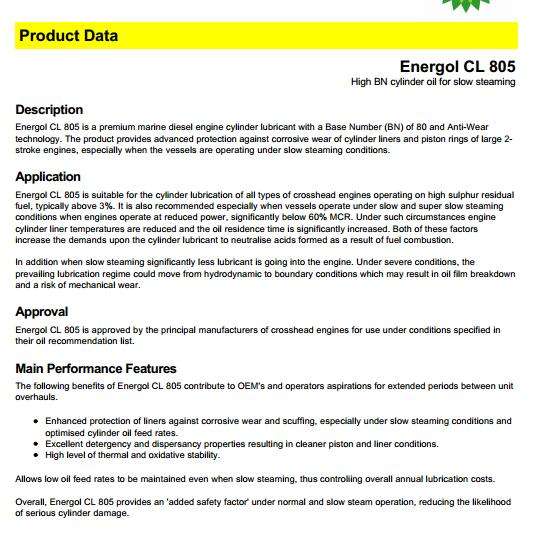 CL 505被定位在BN水平,以配合其它BP船用氣缸油,以滿足某些客戶的要求