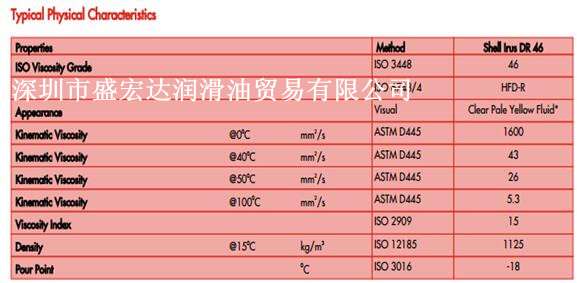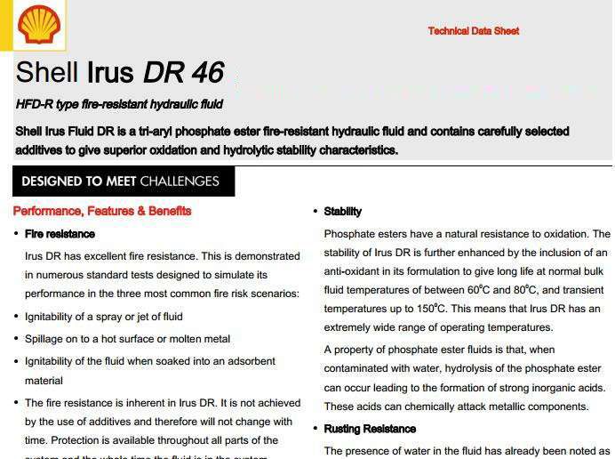 SHELL IRUS DR46 本產品由三芳基磷酸脂組成的合成型防火液壓油,并加有精選的抗氧化,防水解,抗腐蝕等添加劑,以確保該防火液壓油具有優異的氧化穩定性和水解穩定性.
