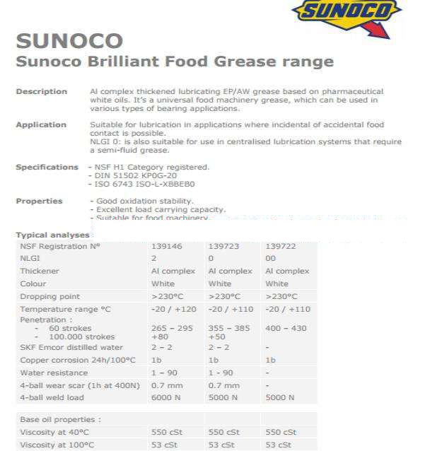 抗磨極壓復加粗(EP / AW)潤滑劑基礎油制藥白。這些通用潤滑脂食品設備,可用于不同類型的軸承。潤滑方法,也許偶然接觸食品。NGLI 0還適用于集中潤滑系統需要潤滑劑糊狀。