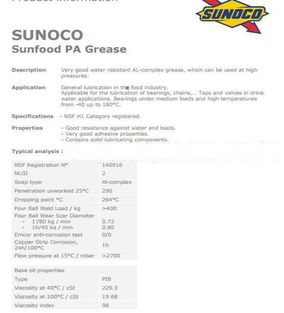 食品工業中主要潤滑。用于潤滑軸承、鏈條、起重機和閥門產品接觸飲用水。軸承溫度高和平均負荷從- 40°至180℃