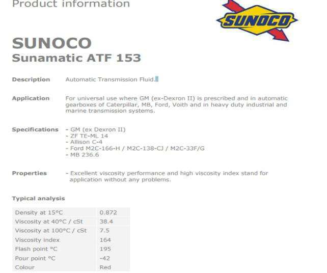 Very shear stable universal ATF, MB 236.6 approved, Allison C-4 qualified. Meeting Ford Mercon, M2C-138-CJ and M2C-166-H. Voith DIWA and ZF quality.