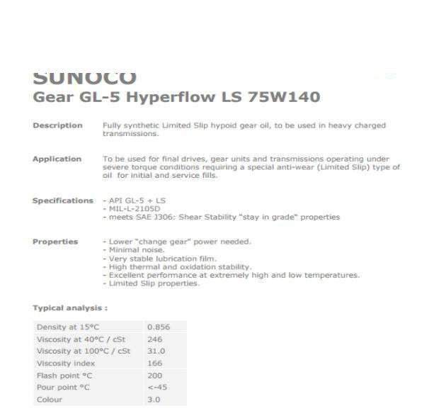 描述完全合成的限滑雙曲線齒輪油,…規(guī)格- API GL-5 + LS對于那些100%合成潤滑油和在需要傳輸?shù)奈⒎謶?yīng)用于潤滑油GL-5機油更換周期很長。優(yōu)異的耐氧化和75w140 SAE 75w90。可用。