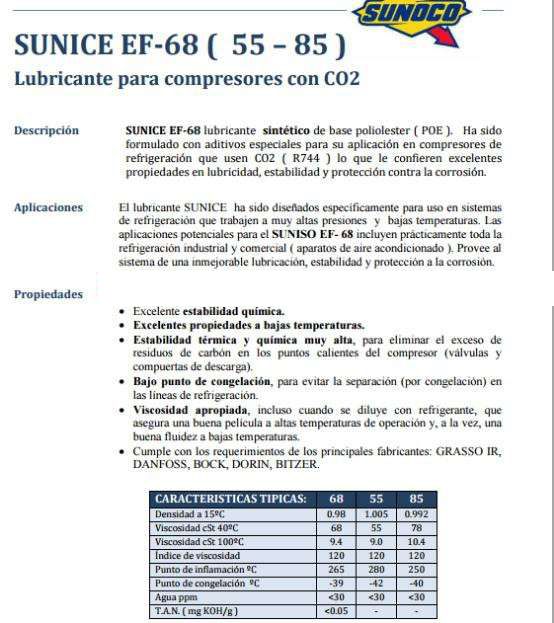SUNOCO SUNICE EF 68 SUNOCO SUNICE EF 55 SUNOCO SUNICE EF 85 CO2壓縮機潤滑 sunice EF - 68 poliolester合成潤滑油(POE)的基礎。已 含特殊添加劑,壓縮機上的應用使用CO2冷卻(R744)所賦予的優秀 屬性中的潤滑性,穩定性和防腐蝕保護。 應用sunice潤滑油是專門為在系統的使用冷卻工作的非常高的壓力和溫度。的 suniso潛在的用途包括幾乎所有的EF - 68工業和商業制冷(空調)。適應 一個極好的潤滑系統,穩定性和防腐蝕。 性能 ?優異的化學穩定性。 ?優異的低溫性能。 ?很高的熱穩定性和化學穩定性,消除過剩 煤矸石的熱點(閥和壓縮機閘門)。 ?在冰點以下,以防止分離(凍結)冷卻水管。 ?適當的粘度,即使稀釋液, 保證良好的膜在高溫下操作,在一次良好的低溫流動性。 ?符合制造商的要求:格拉索去,DANFOSS, BOCK, DORIN, BITZER.