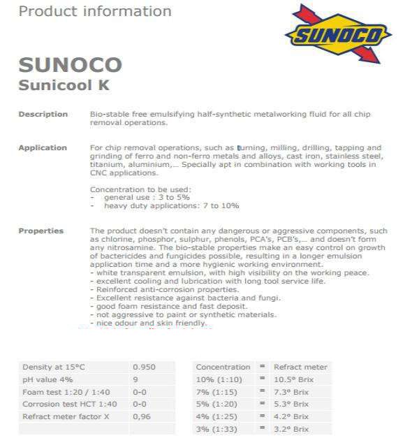 生物穩定乳化部分合成金屬加工液的所有芯片移除操作。sunicool K適用于鐵和非鐵金屬、不銹鋼合金、鑄鐵和鋁。這特別和在數控應用中的工作工具相結合
