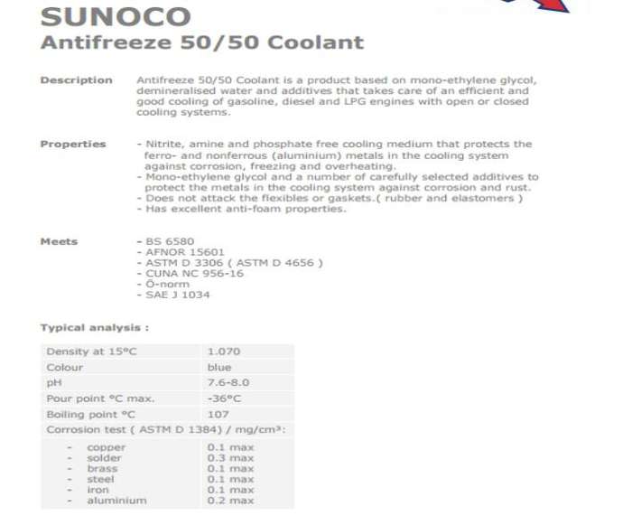 說明防凍液50 / 50冷卻液是一種基于單乙二醇的產品,
