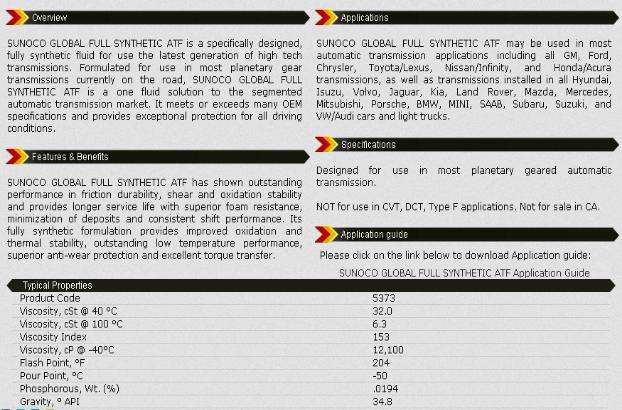 SUNOCO GLOBAL FULL SYNTHETIC ATF可用于大多數自動變速器的應用包括通用、福特、克萊斯勒、豐田、雷克薩斯、日產/本田/謳歌無限,和傳輸,以及安裝在所有的現代、五十鈴、沃爾沃、捷豹、起亞、路虎、馬自達、奔馳、三菱、保時捷、寶馬、迷你、薩博、斯巴魯、鈴木變速箱、和大眾/奧迪汽車和輕型卡車。