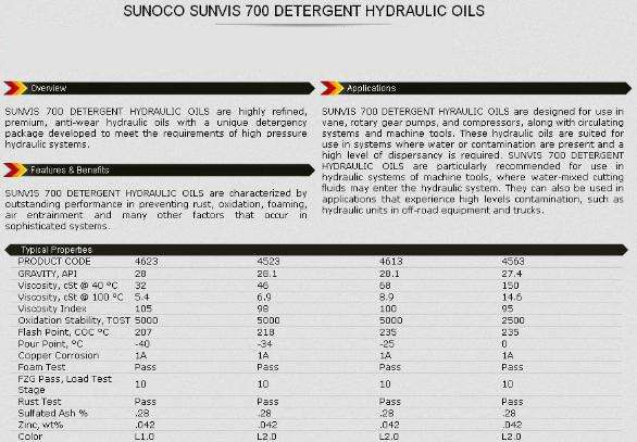 SUNVIS 700 DETERGENT清洗液壓油是高度精煉,溢價,抗磨液壓油具有獨特的去污包來滿足高壓力的液壓系統的要求。
