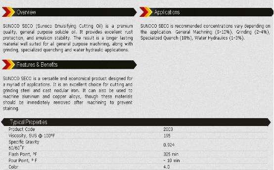 太陽石油SUNOCO SECO太陽石油切削乳化油)是通用的優質質量、可溶性油。它提供了出色的穩定性和乳液的防銹保護。持久的好材料通用加工,磨削,淬火液和水的實際應用。
