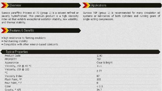 Sunoco paraffinic Process oil 70 (group 1)是一種嚴(yán)重的溶劑精制或加氫精制。該高級產(chǎn)品是一種高粘度指數(shù)油,具有優(yōu)異的氧化穩(wěn)定性、低揮發(fā)性和熱穩(wěn)定性。