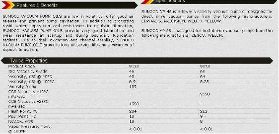 Sunoco VP 46是粘度較低的真空泵油直接驅動器設計真空泵從以下的廠家,愛德華茲,韋爾奇,黃精。