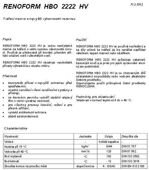 描述 RENOFORM HBO 2222 HV在成形的潤滑油具有很高的性能水平。 最好在使用精確的st?í-壓 鋼和鋼材hání和高尚的運動。 RENOFORM HBO 2222 HV包含高壓高壓高壓 完全無氯含量的成分。 優先 ?濃縮成分最高的保護 磨損, ?容易沉積系統和所有的naná?ecími 裝置 ?在金屬表面形成穩定的油 這部電影具有很高的承載能力, ?所有的過程,沖壓,沖壓和 精確的剪切, ?高防腐保護, ?可處理好。 使用 RENOFORM HBO 2222 HV使用 它可用于對零件成形的應用,例如 maznicí或輥涂,滴。 renoform HBO 2222高壓引起的變色 有色金屬加工,因此,他們是合適的 只是有條件的。 RENOFORM HBO 2222 HV是從零件制造 vodnymi堿溶劑或是一次性的 的洗滌劑。 我們建議您使用工業清潔劑 renoclean。 儲存條件。 存儲溫度范圍從0到+ 40°C。