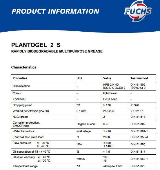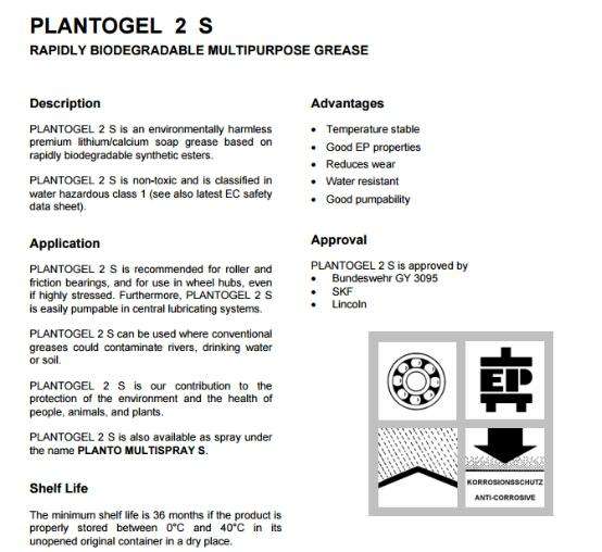 PLANTOGEL 2 S推薦的平原和滾子軸承,即使高度強調。 PLANTOGEL 2 S,可以使用正常的多用途或EP潤滑脂由可生物降解的產品,應及時更換。 通常在傳統的油脂可能會污染河流,飲用水水體或土壤。