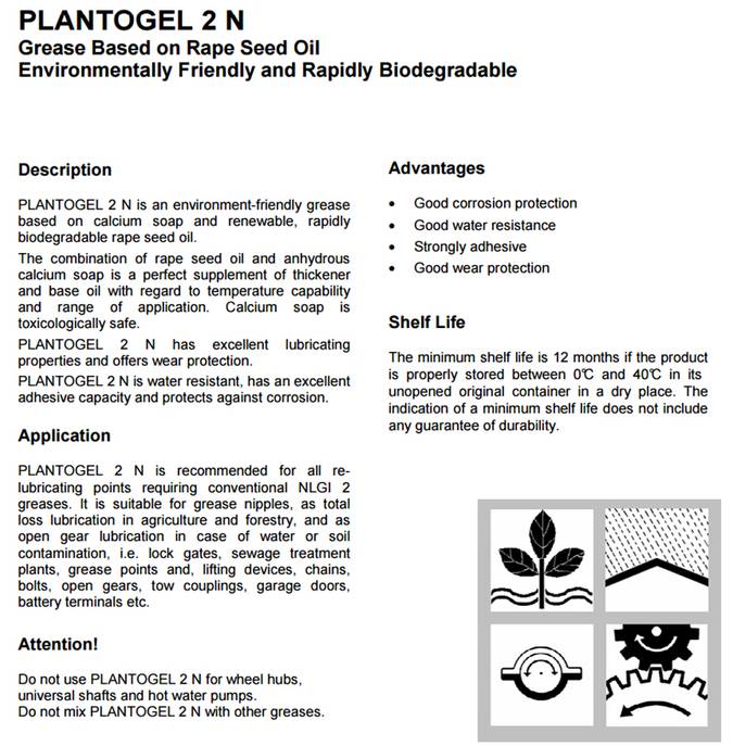 PLANTOGEL 2 S是一種對環(huán)境無害的溢價鋰/鈣皂潤滑脂的基礎上快速生物降解的合成酯。
