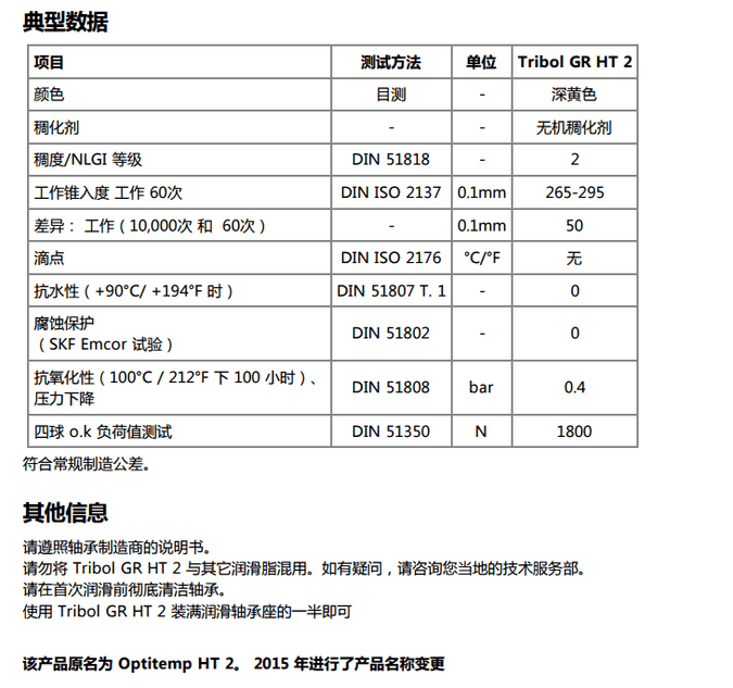 產品說明 Castrol Tribol? GR HT 2(原名 Optitemp? HT 2)是一種適用于長潤滑周期的高性能潤滑脂,適合用在于高工作溫度下 以及正常或中等軸承壓力下工作的滾動和滑動軸承。 Tribol GR HT 2 呈淺色。
