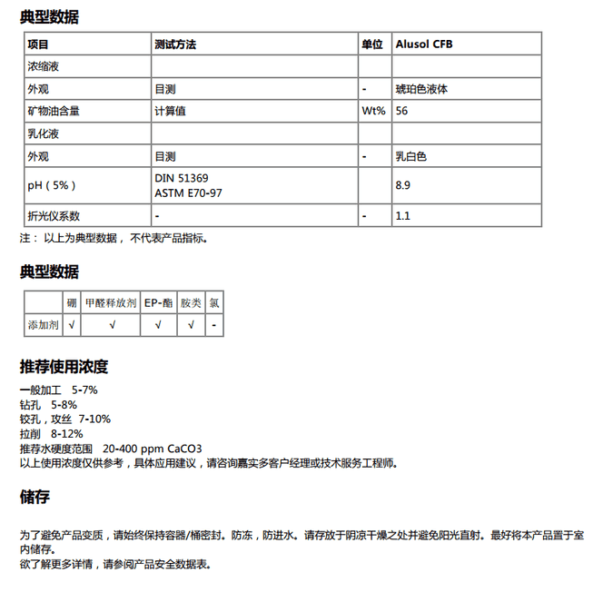 嘉實(shí)多 Alusol? CFB 是一款高性能且不含氯的水溶性金屬加工液。本產(chǎn)品基于獨(dú)特的添加劑技術(shù),特別推薦用于各種鋁合金 加工,有助于顯著改善加工性能并提升表面光潔度,在保持極佳產(chǎn)品穩(wěn)定性的同時提高生物穩(wěn)定性; 繼而幫助客戶降低總體 運(yùn)營成本。 本產(chǎn)品適用于大型中央系統(tǒng)和單機(jī)系統(tǒng)。