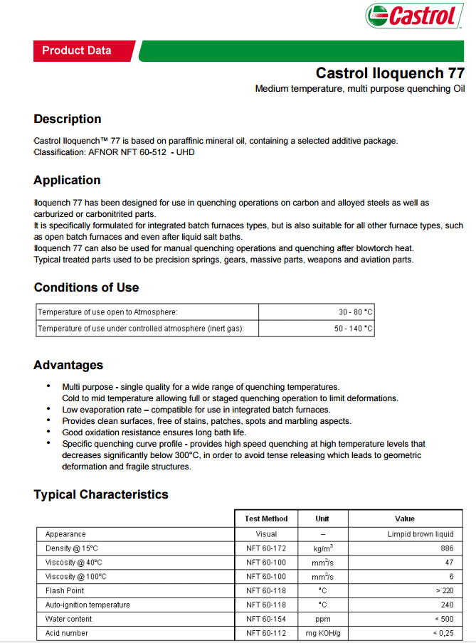 iloquench 77被設計為使用碳和合金鋼淬火操作以及滲碳或carbonitrited部分。