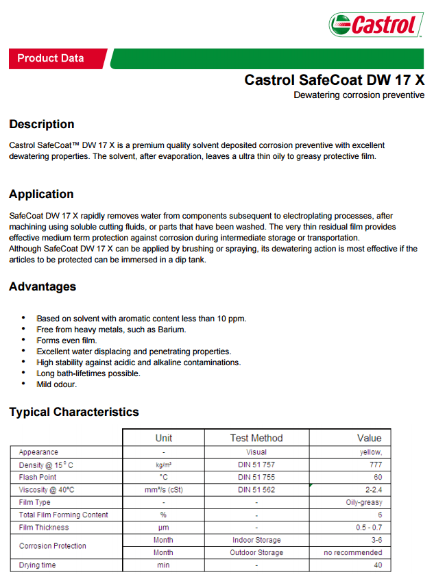 嘉實多SafeCoat DW 17 X迅速除去水從部件到電鍍過程后,后