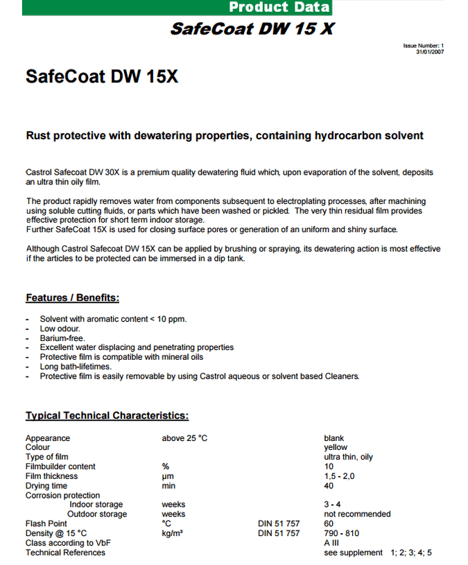 Castrol Safecoat DW 15X是優質脫水液,隨著溶劑的揮發,存款