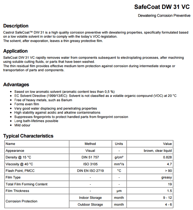 薄的殘余膜提供了有效的中期保護,防止在中間儲存或腐蝕過程中零件和部件的運輸。