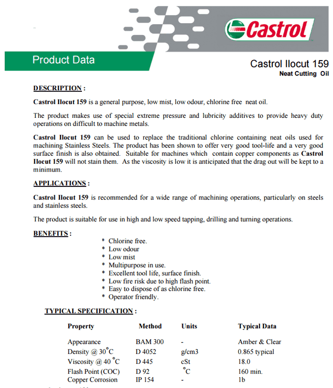 Castrol Ilocut 159是一種通用的,低霧,低氣味,無氯凈油。