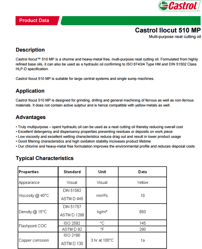 Castrol Ilocut 510 MP是氯和重金屬自由,多用油性切削油。制定高