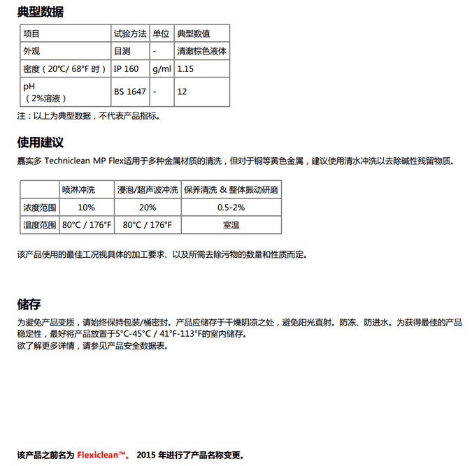 Techniclean MP Flex的用途包括: 針對各類現代化機械設備的工業過程清洗,包含了噴淋式沖洗、浸泡式清洗、超聲波清洗等各種清洗方式;能夠有效 去除各類難以清洗的污漬,比如重負荷的油性切削液、成型油、油脂、含蠟防銹油膜、潤滑油、潤滑脂、碳、金屬碎 屑以及車間內的普通污垢。