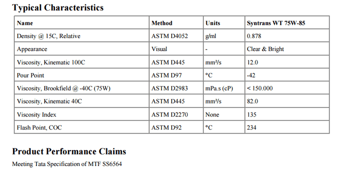 Castrol Syntrans WT 75W-85是一部分合成手動變速箱油特別推薦塔塔手動變速箱