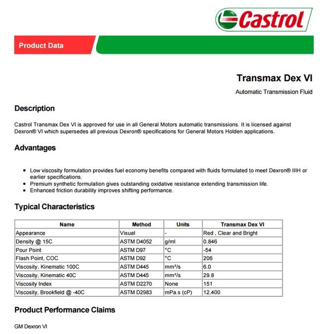 ®Dexron VI,取代以前所有的®Dexron規格Holden汽車應用。