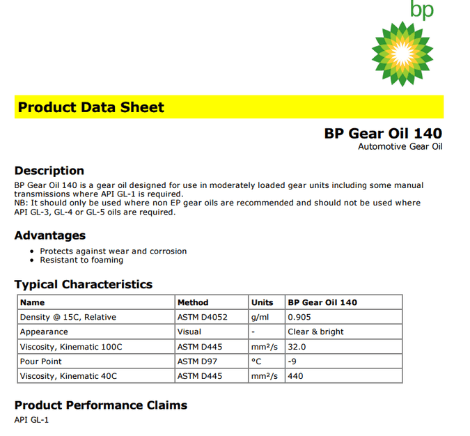 BP Gear Oil 140齒輪油是一種齒輪油,專為在中等負荷的齒輪組,包括一些手冊