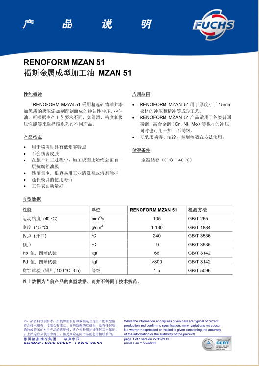 福斯FUCHS RENOFORM MZAN 51CN金屬成型油詳細說明 (瀏覽2461次)