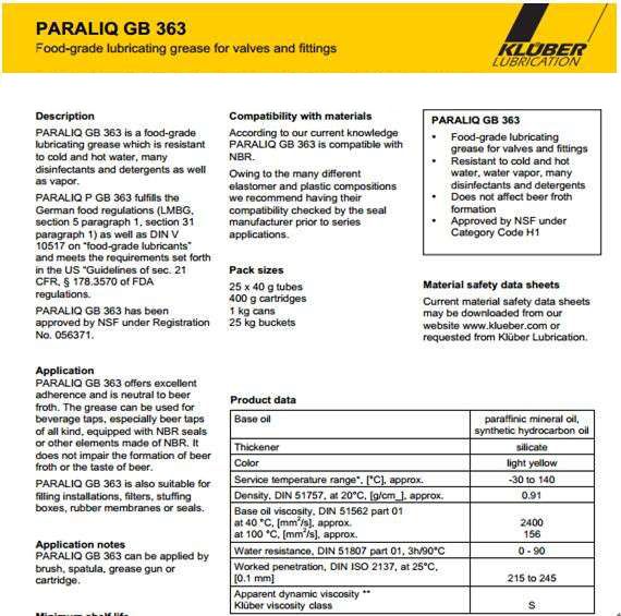 PARALIQ GB 363閥門及配件用食品級潤滑脂具有高附著力和啤酒泡沫是中性的。 它也顯示了良好的抗水和水蒸汽。