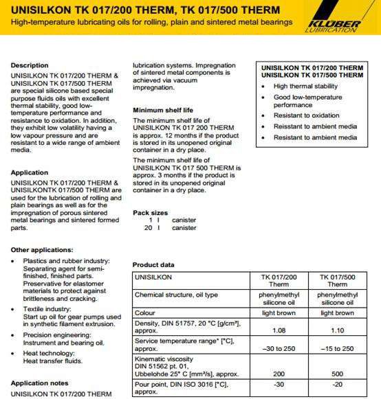 用于軋制、純和燒結金屬軸承的高溫潤滑油,滑動軸承和燒結UNISILKON TK 017/200熱敏電阻; UNISILKON TK 017/500熱敏電阻的熱應力潤滑油具有良好的耐寒性和氧化穩定性。 這些油的特點是低蒸氣壓和低波動性。 在這些合成油是一個很好的耐介質性。
