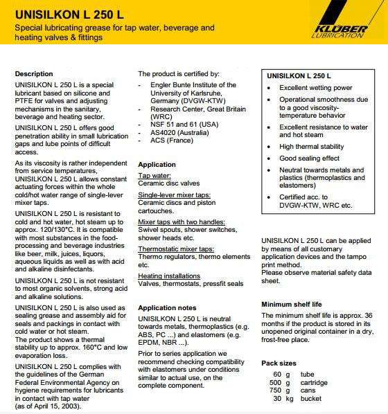 加熱閥門及配件的潤滑劑硅油和PTFE的基礎上,具有較高的熱穩定性。 在狹小的縫隙和硬UNISILKON L 250 L提供了良好的潤濕性,,達到脂潤滑點。 潤滑脂的相對高的粘度提高粘結性,即使在不利的幾何形狀。 UNISILKON?250 L,耐冷,熱水和過熱蒸汽約130°C,以及行業標準的水性清潔劑和消毒劑。 UNISILKON L 250 L也耐到的可泵送食品和飲料,比如果汁,啤酒或牛奶產品。 UNISILKON L 250 L是耐有機溶劑,強酸和強堿。