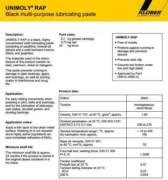 UNIMOLY RAP是一個黑色的,高度集中,固體潤滑膏。 的化學結構是石蠟礦物油,固體潤滑劑和硅酸鹽的混合物(二硫化鉬和石墨)。 用于生產無原料被使用,它含有鉛,鎘,鎳,或鹵素。 粘貼防止運行中損壞軸承,齒輪和灌木以及壓著,并通過座椅的得分。