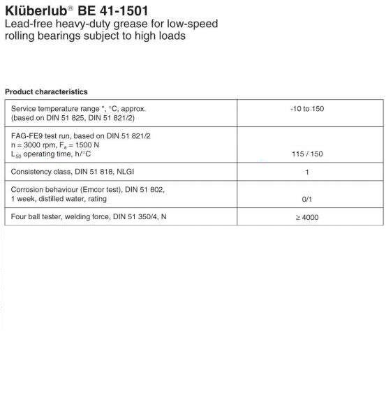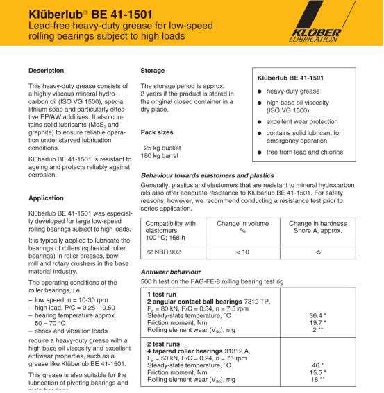 KLUBERLUB BE41 1501這種重載潤滑脂由高粘度礦物烴油(ISO VG 1500)、特殊鋰皂基和特效EP/AW添加劑構(gòu)成。它也含有固體潤滑劑(二硫化鉬和石墨),因而能保證在缺油條件下的可靠運行。 Kluberlub BE 41-1501能抗老化,并能有效進行防腐蝕保護。 應(yīng) 用: Kluberlub BE 41-1501是專為大型低速重載滾動軸承開發(fā)的。 它的典型應(yīng)用是在基礎(chǔ)工業(yè)中,輥壓機、球磨機和旋轉(zhuǎn)式破碎機中的輥子軸承(調(diào)心軸承)的潤滑。