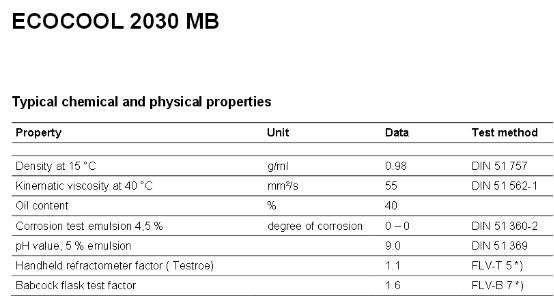 ECOCOOL 2030 MB 描述 ECOCOOL 2030 MB是一種礦物油基,水加工的水溶性切削液和磨削 鋼,鑄鐵和鋁合金。 ECOCOOL 2030 MB是免費的氯,硫和 磷。 ECOCOOL 2030 MB是免費胺容易 形成亞硝胺。 ECOCOOL 2030 MB產生異常 壽命長,細分散,穩定和米色乳白色 乳化時與水混合。 應用 ECOCOOL 2030 MB,建議為所有歌劇 正常tions和高合金鋼以及粗糙 鋁合金ING罰款精加工操作。 推薦濃度: 鋼 -一般加工:5 - 8% -磨: 4.5 - 6% 鋁 -一般加工:5 - 12% -磨: 4.5 - 6% 好處 ?高乳化穩定性 ?良好的冷卻和潤滑效果 ?優異的潤濕能力 ?優異的耐腐蝕保護 ?低發泡 ?出色的pH值穩定 ?適合使用在單獨填充機以及 作為中央系統 ?皮膚兼容根據TEWL測試 ?低水的污染類別 ?符合611德國TRGS ?久經考驗的配方,在廣泛的領域APPLI 陽離子。