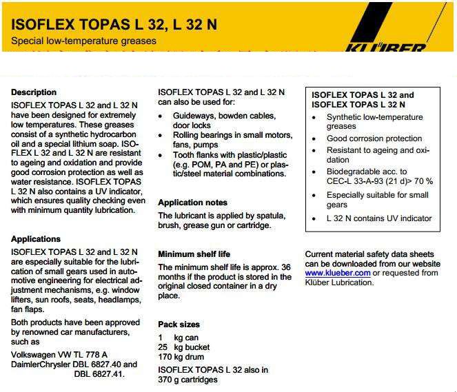 特殊低溫潤滑脂。 它們包括合成烴油,以及一個特殊的鋰皂。 ISOFLEX TOPAS L 32和L 32 N的老化和氧化,具有良好的防腐蝕和抗水。 通過添加UV指標ISOFLEX TOPAS L 32 N是,控制在質量保證的目的。