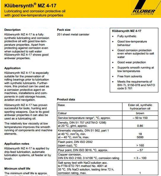 克魯勃MZ 4-17是一種全合成潤滑油具有良好的低溫性能和防腐蝕保護油。 除了良好的防腐蝕保護(包括食鹽水的影響)區別開來的產品,良好的抗磨損保護。