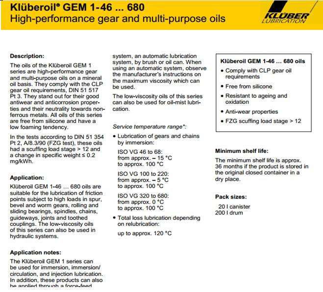 克魯勃GEM 1 油提供了一個的膠合承載高,從ISO VG 150 API GL-4。 變速箱也非常高的峰值載荷,振動和振蕩的充分保護,防止劃傷。